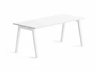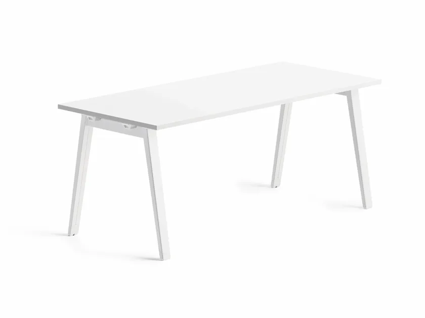 Gambe metalliche, a forma di cavalletto, composte da un traverso orizzontale in tubolare metallico a sezione rettangolare e da due montanti verticali realizzati in lamiera stampata con forma a sezione variabile. La struttura è disponibile nelle finiture bianco, alluminio e antracite. Su richiesta le colorazioni rosso mattone, azzurro polvere e verde salvia. Piani di lavoro sp. 25 mm e modesty panel sp. 18 mm realizzati in melaminico, disponibili in tutte le finiture a listino. Travi a binario integrabili con vari accessori, tra cui cassettiere portanti e porta cpu. Il sistema permette di riposizionare gambe e accessori a piacimento, anche dopo la prima installazione.