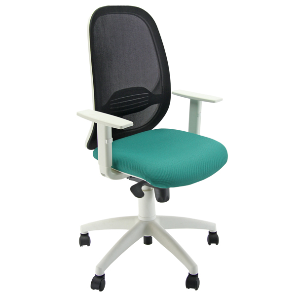 Sedia girevole su ruote con sedile in rete portante e schienale in rete nera, elevazione a gas. Supporto lombare regolabile, meccanismo syncro tra sedile e schienale, a contatto permanente. Rivestimento seduta in tessuto “SUPER-Target” 100% poliestere, idrorepellente e antimacchia, reazione al fuoco classe 1. Completa di braccioli regolabili. Alt.tot: 102-113cm; Prof.tot: 68cm; Alt.schienale: 60cm; Largh.schienale:48cm; Largh.sedile: 48cm; Prof.sedile: 46cm; Alt.sedile: 42-54cm.